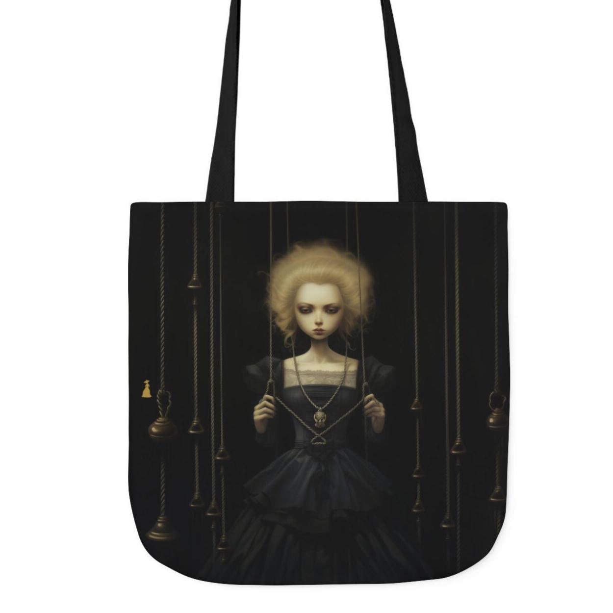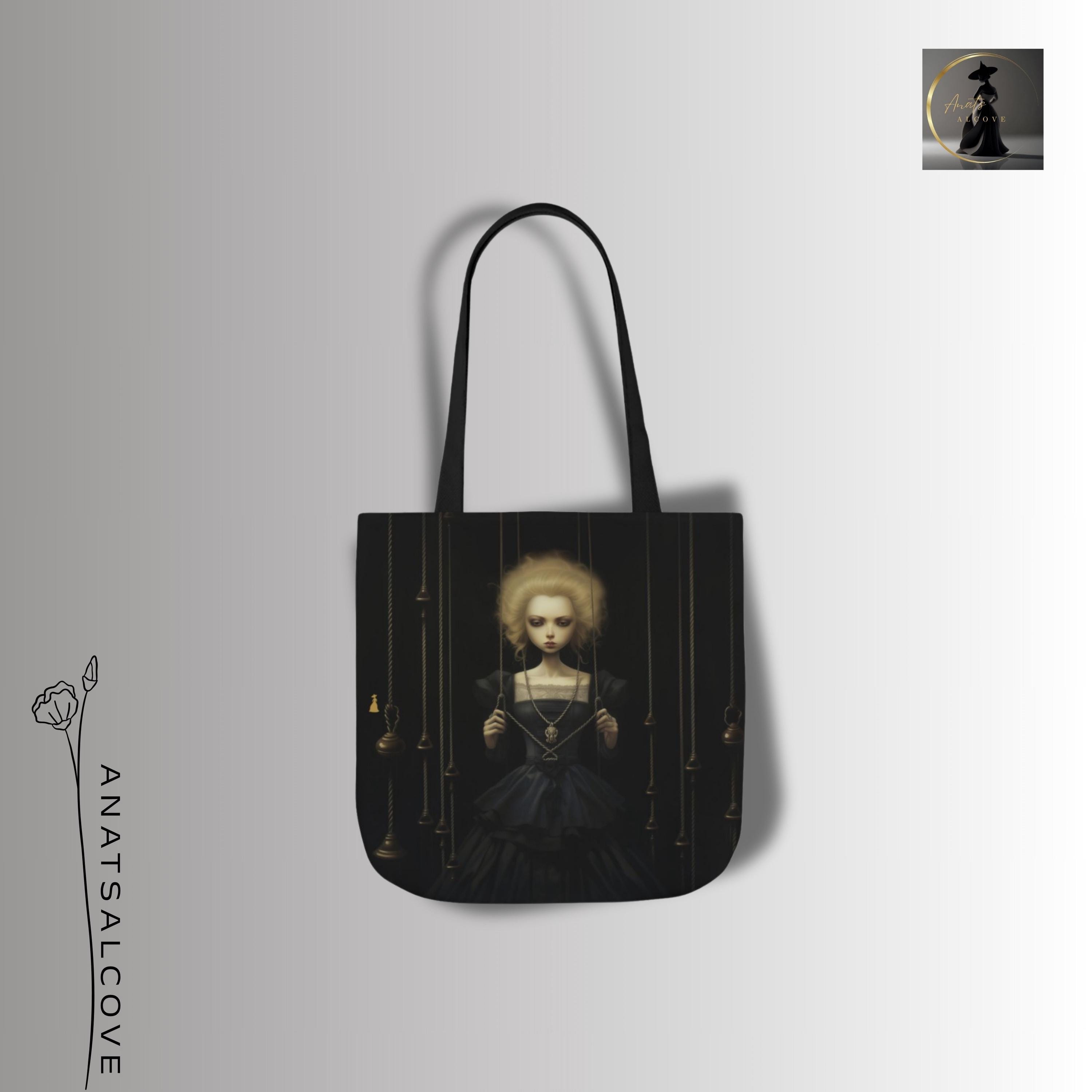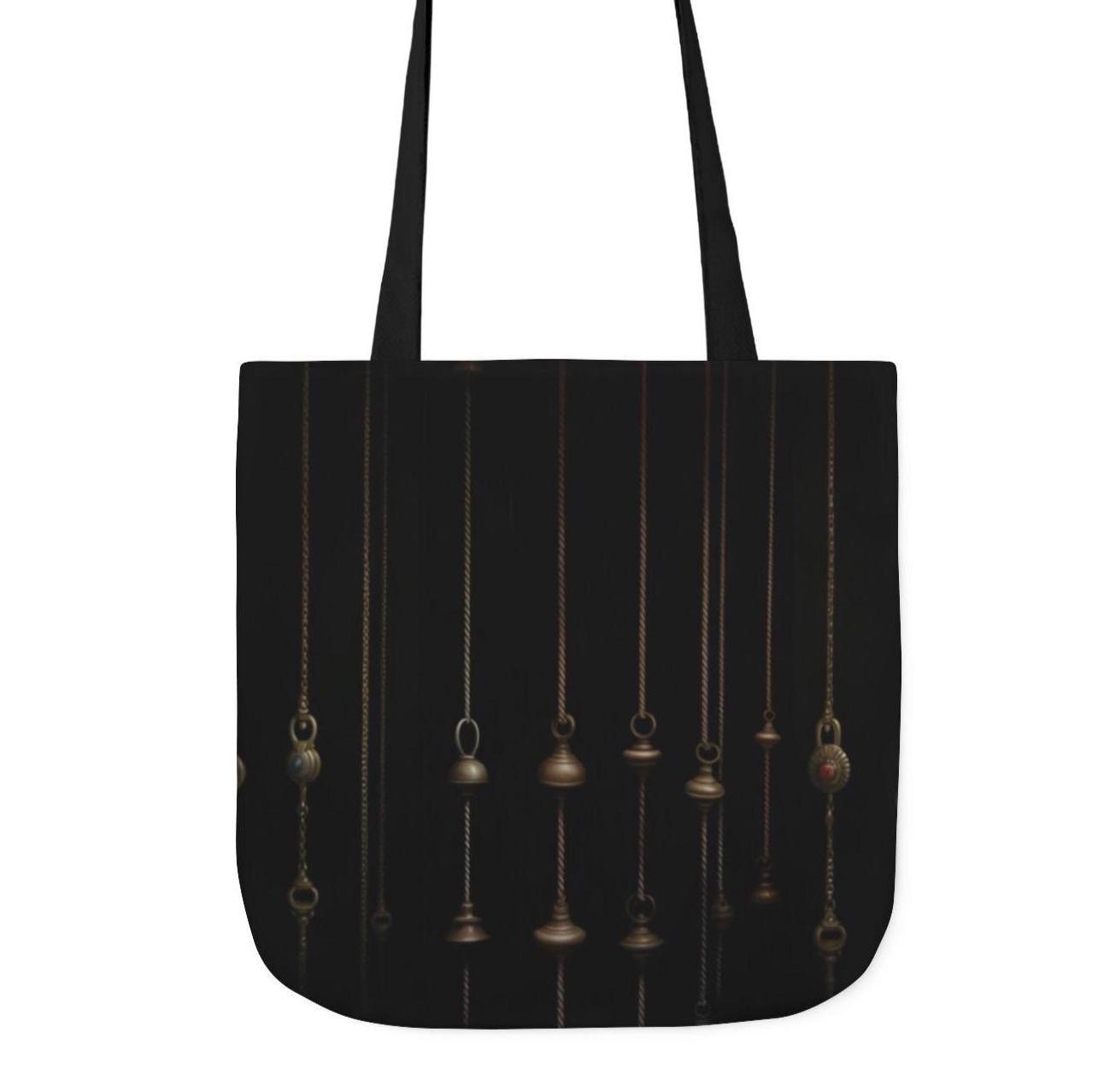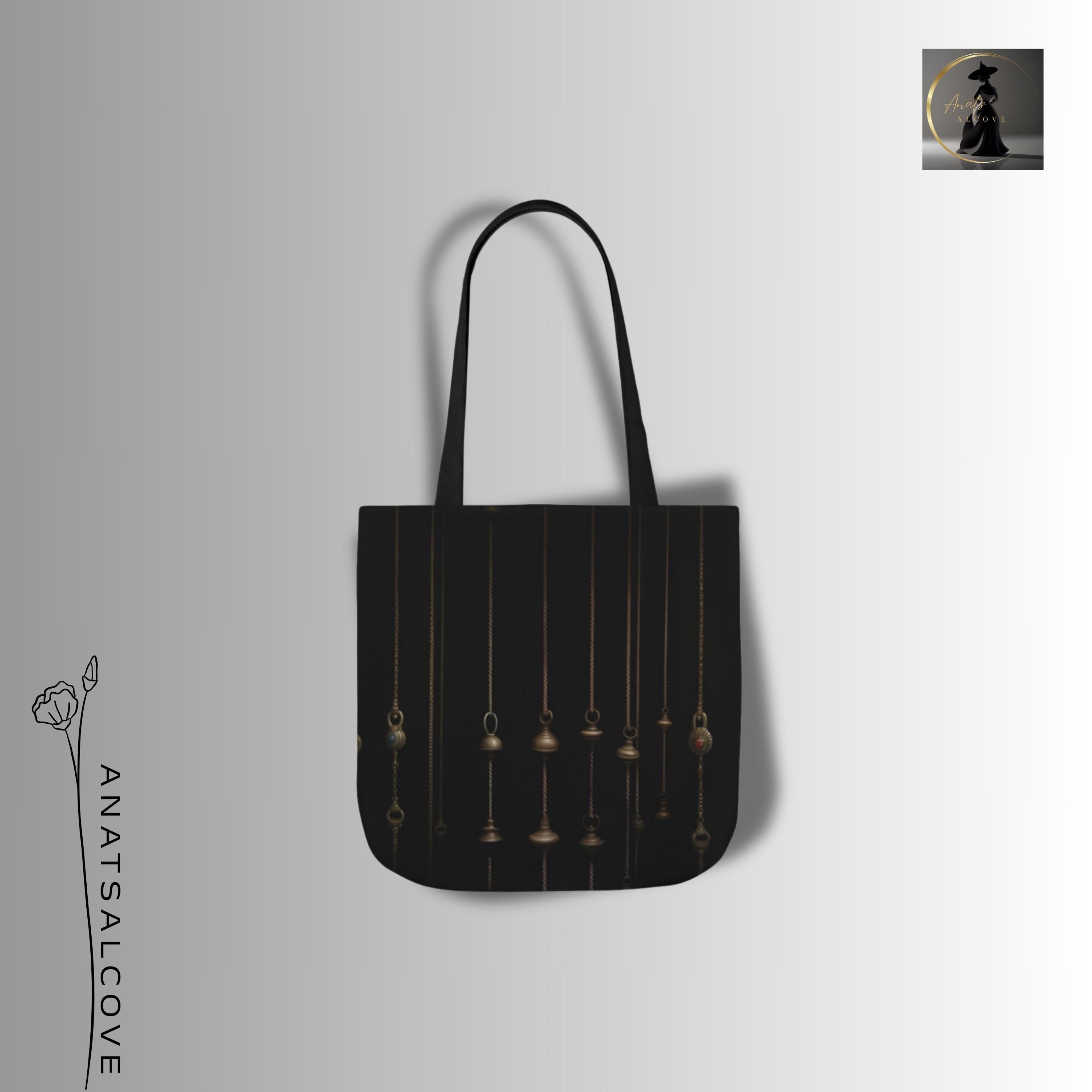 Lightweight and durable polyester canvas tote bag, features a printed unique design, crafted with meticulous care. The inside has a sleek black lining and its comfortable black strap. For quick errands in style, shopping trips, and longer travels. 13"x13". Each bag holds its own enchanting story.