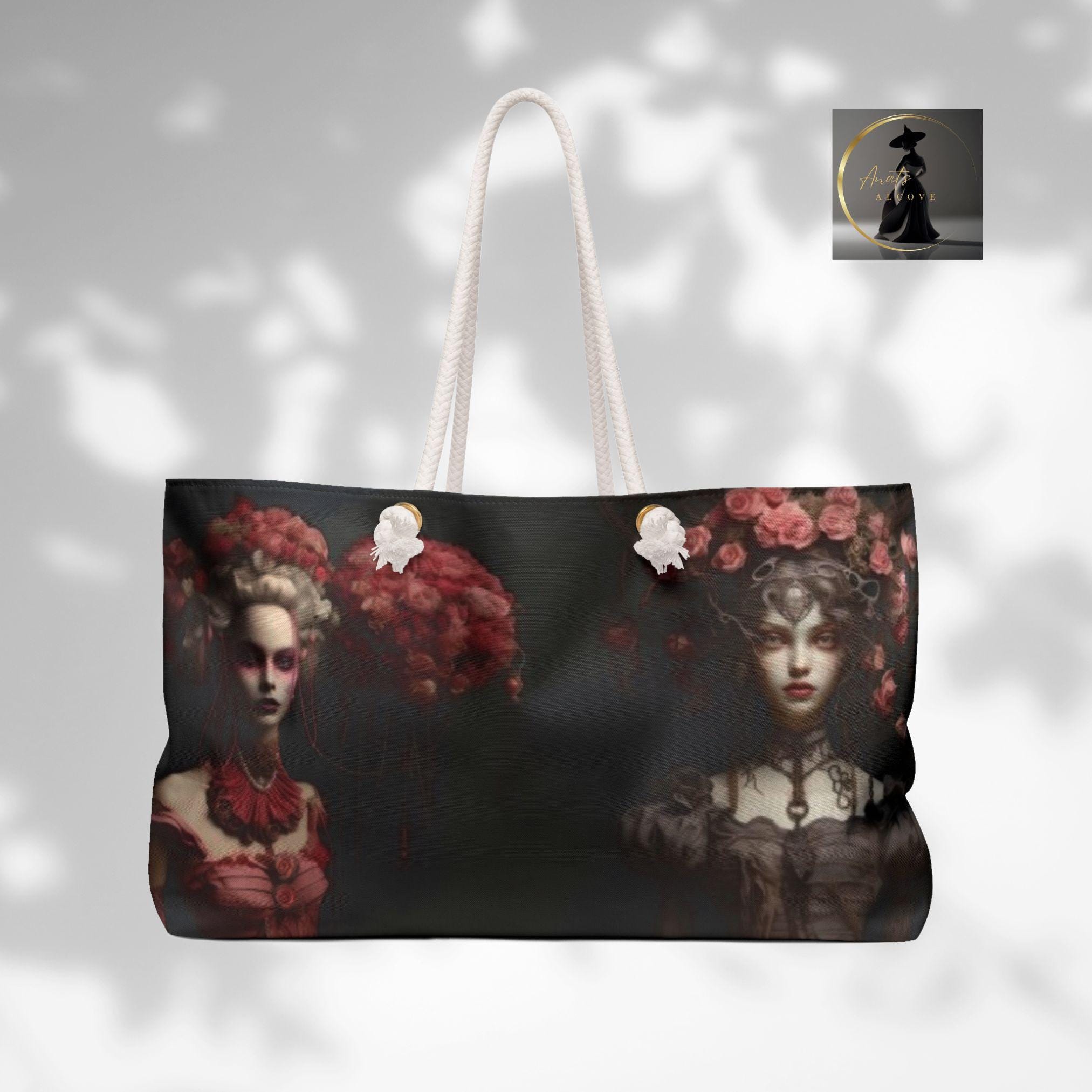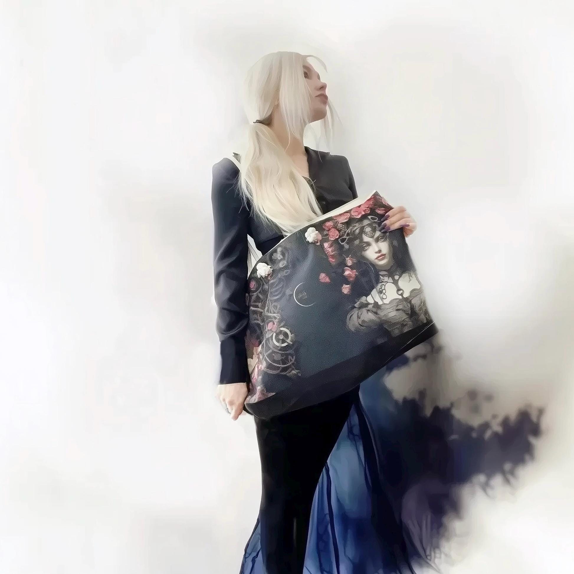 Discover the Coven Comprehensive Tote Collection, a blend of style and creative charm. The Comprehensive Coven Tote is for those who love some fantasy in their fashion, featuring detailed printed designs, intricate florals, crowns and cascading roses rendered in a dark and romantic colour palettes. Made from durable spun polyester, this large tote bag is practical and eye-catching, crafted from durable fabric, it provides strength and water resistance. For everyday use or special occasions, this canvas tote bag is comfortable to carry and built to last. Available in 5 colourful designs: Crimson, Gold, Juniper Green, Indigo, and Azure Blue, perfect for shopping, picnics and beach days. Add a touch of dark elegance and fantasy to your wardrobe with the Victorian-inspired tote collection, perfect for daily use or as a memorable gift for a friend.